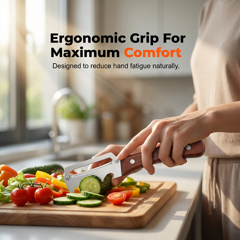 ERGONOMISCHE GRIP VOOR MAXIMAAL COMFORT - Ervaar moeiteloze voedselbereiding met onze ergonomisch ontworpen houten handgreep. Deze past perfect in uw handpalm en biedt een veilige, antislip grip die handvermoeidheid bij repetitieve taken aanzienlijk vermindert.