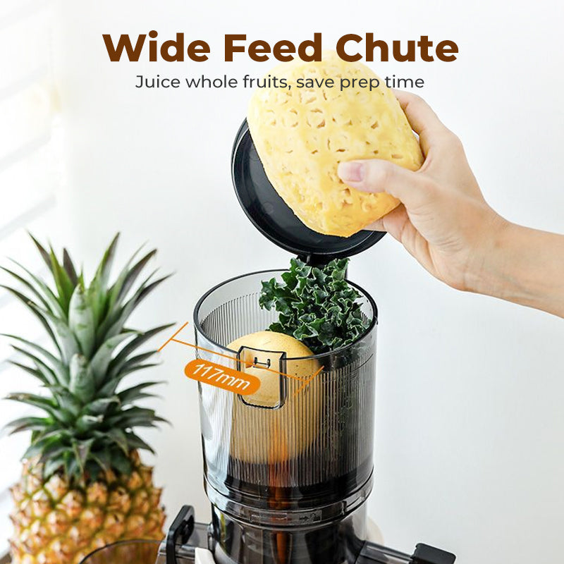 BREDE INVOEROPENING VAN 117 MM - Pers hele vruchten zoals appels en peren zonder ze eerst te hoeven snijden. Deze functie heeft u 's ochtends aanzienlijk veel voorbereidingstijd opgeleverd, waardoor uw dagelijkse sapbereiding sneller en effectiever verloopt.